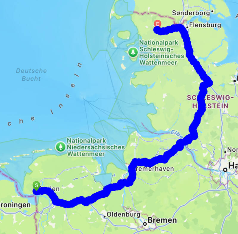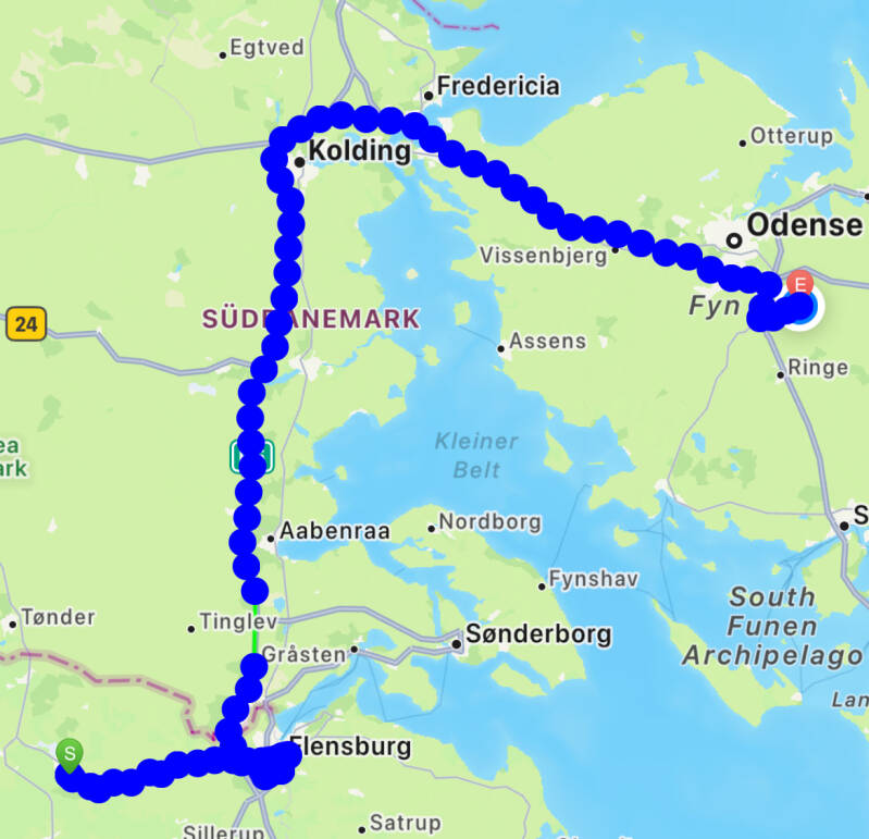 On the Road, einmal von Westniedersachsen an den nördlichsten Rand der Republik. Heute machten wir Strecke, wir wollten Deutschland möglichst schnell hinter uns bringen und sind von Emden bis Flensburg gefahren. Wir wollten uns den Elbtunnel in Hamburg ersparen und sind deshalb mit der Elbfähre von Wischhafen nach Glückstadt geschippert. Da war mächtig was los, wir warteten zwei Stunden auf die Überfahrt mit ganz vielen anderen Feiertags-Reisende, das Warten hat sich aber gelohnt😉. Übernachtet haben wir westlich von Flensburg auf einem kleinen nettem Campingplatz. Coco wird sein Darmproblem nicht los, also wieder Nachts raus.