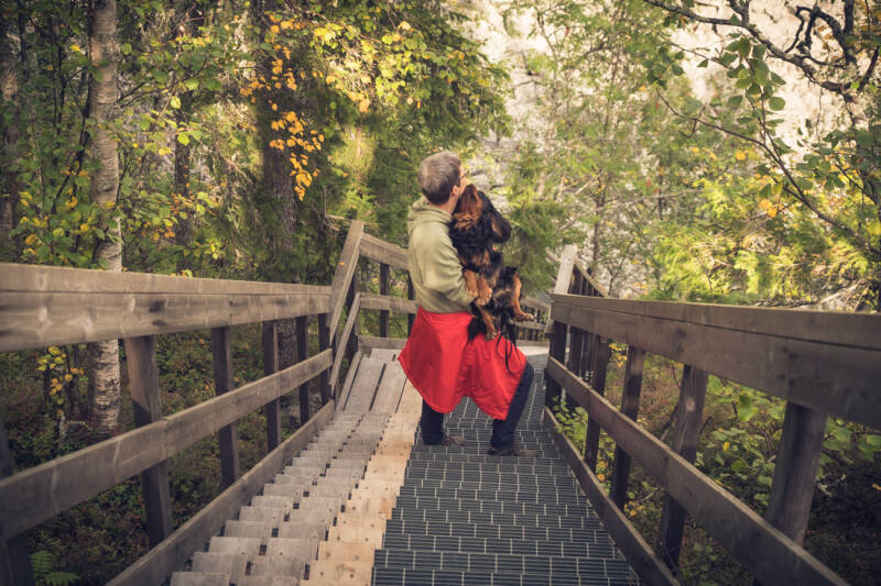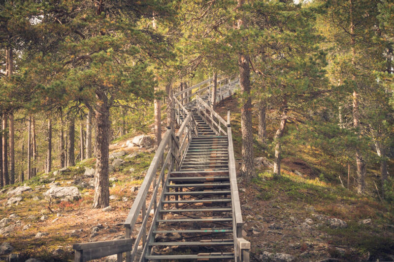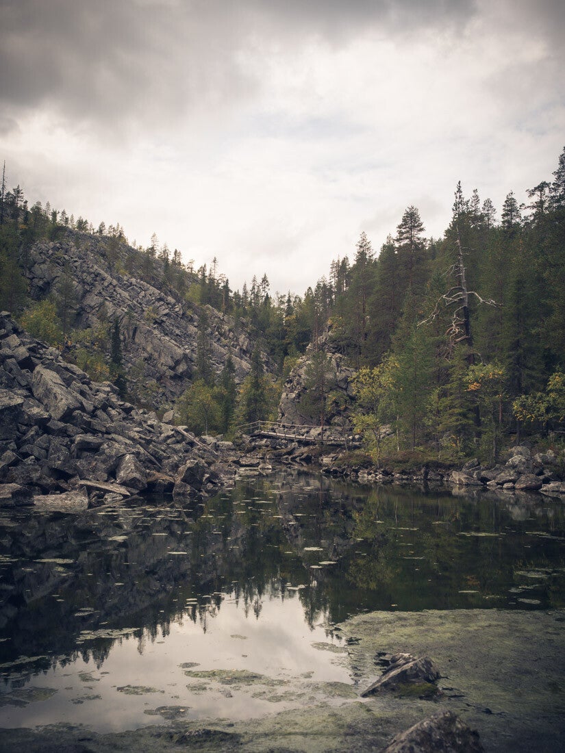 Die Isokuru-Schlucht gilt als die tiefste Schlucht Finnlands. Ihre Felswände ragen zum Teil steil bis zu 220 Meter in die Höhe. Diese einzigartige Landschaft wurde vor über 2,5 Milliarden Jahren geformt und trägt noch heute die Spuren der letzten Eiszeit, wie z. B. versteinerte Wellenmuster und Kieselsteine. Wir mussten Coco z. T. Tragen, da er immer noch humpelt und es einige steile Treppen zu überwinden gab.