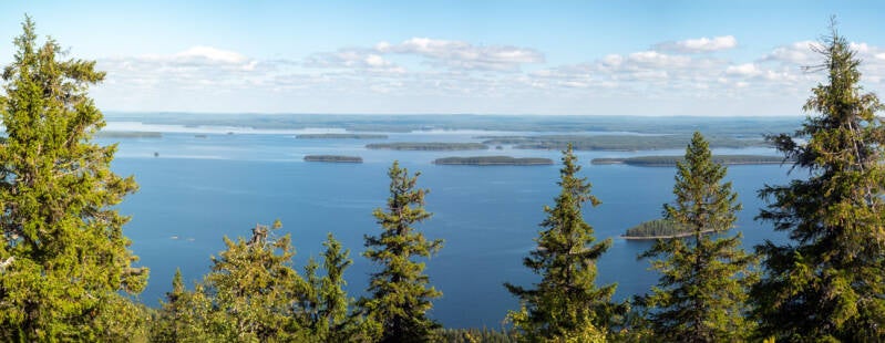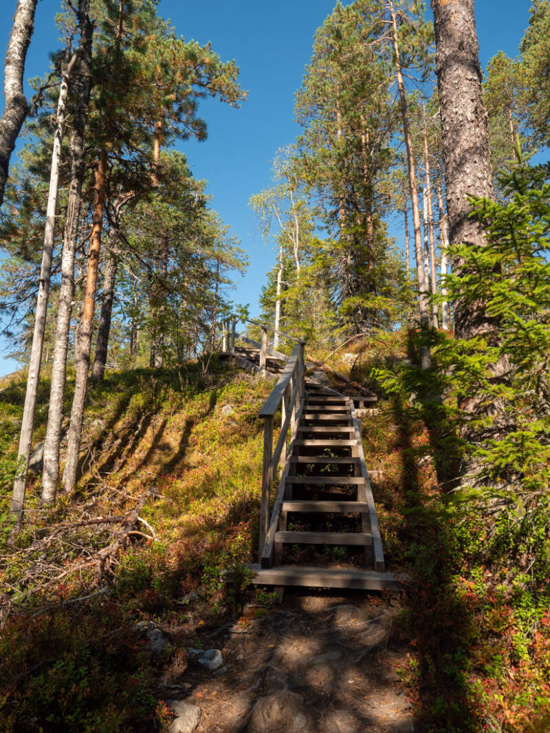 Am Morgen fuhren wir mit unserem Camper einmal um den halben Berg Koli, um zu einem Wanderparkplatz auf der anderen Seite zu gelangen. Von hier aus begann unser Weg auf den Berg. Die vier Gipfel, die unseren Weg kreuzten, erheben sich deutlich, sie sind felsig und kahl und man hat einen sehr schönen Blick auf den See und seine Inseln. Die Inseln sind alle dicht bewaldet. Da wir erst zur Mittagszeit losgingen, ließen wir uns die mitgebrachte Brotzeit auf einen der Gipfel bei bestem Wetter und bester Aussicht schmecken. Die Finnen legen die Wanderwege immer sehr schön an und achten dabei stets auf Sicherheit. Es gibt viele Treppen über steilere Abschnitte und zahlreiche Stege über Feuchtgebiete. Es war eine wirklich schöne Wanderung. Im Anschluss ließen wir uns in dem Café auf dem Gipfel finnischen Kuchen und Kaffee schmecken, bevor wir weiter in Richtung Süden fuhren. Unser nächstes Ziel war ein Parkplatz am finnischen Holzmuseum, um dort zu übernachten.