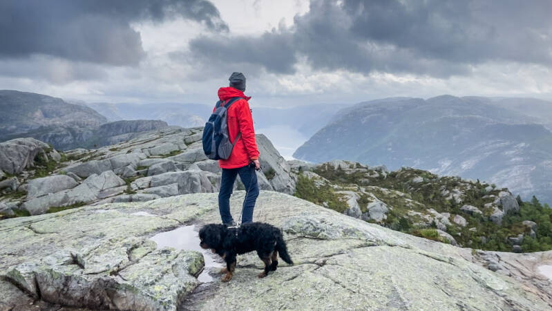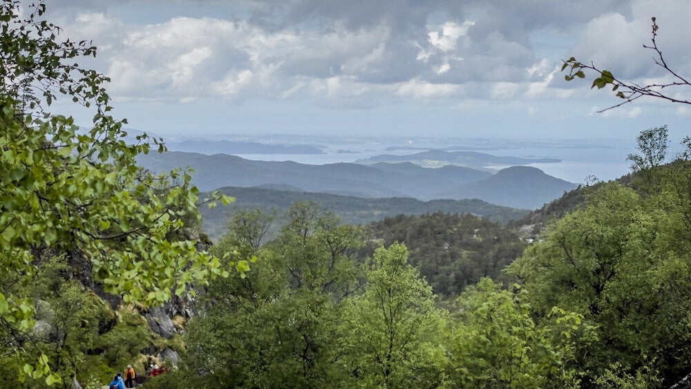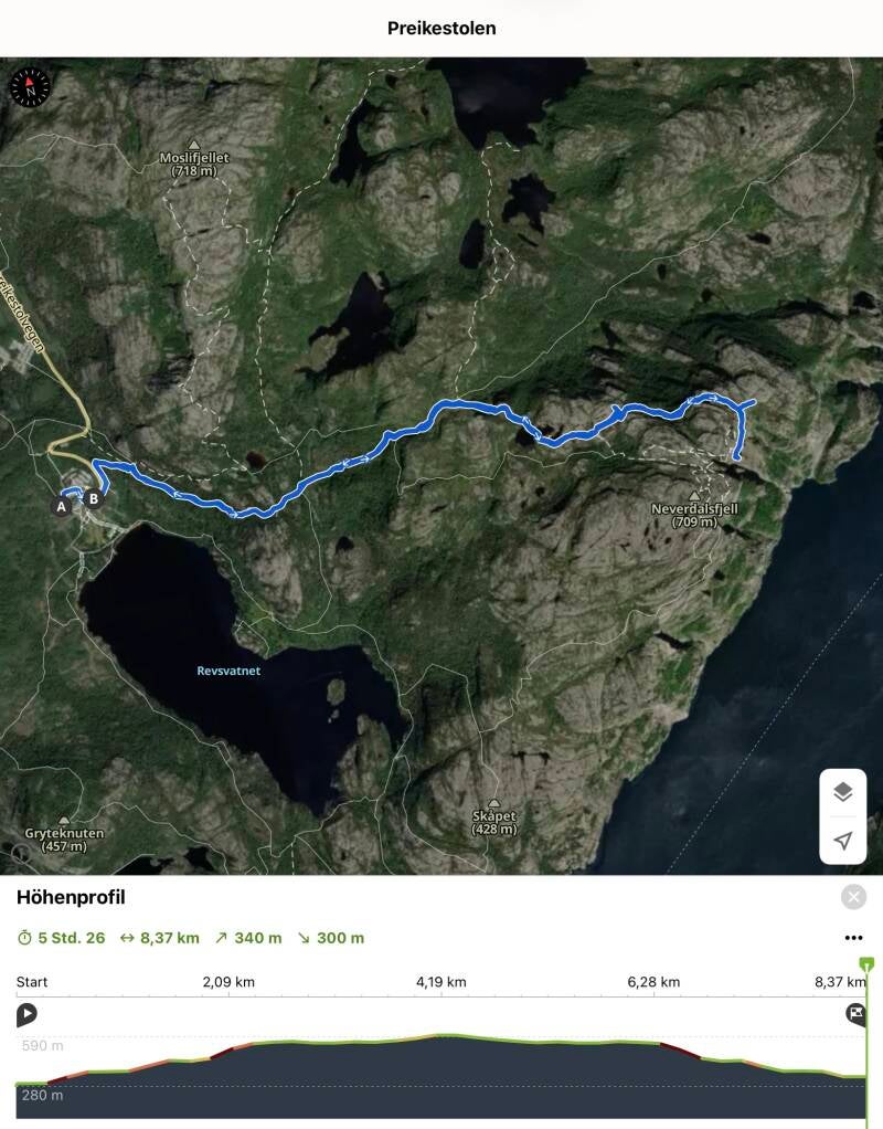 Auf zum, und auf den Preikestolen. Der berühmteste Felsvorsprung/Plateau von Norwegen wurde heute in Angriff genommen. Eine bittere Erkenntnis vorweg, Katrin war die Einzige die sich dann tatsächlich auf den Vorsprung gewagt hat. Stefan wurde von seiner Höhenangst ausgebremst. Aber allein die Wanderung dorthin war atemberaubend mit vielen schönen Ausblicken auf den Fjord und die umliegenden Berge. Die Wanderung war über acht Kilometer lang und z.T. sehr steil. Der Weg besteht meistens aus groben unebenen Felsbrocken. Wir sind sehr früh gestartet und es zeigte sich, dass das die richtige Entscheidung war. Auf unserem Abstieg ging es zu wie am Bahnhof zur besten Reisezeit. Schockiert waren wir über den Leichtsinn mancher Menschen, in Turnschuhen und mit Kleinkindern. Wenn man bedenkt, dass das letzte Stück an einer Felswand entlang geht, die ungesichert 650m gerade runter in den Fjord abfällt. Auch das Wetter ist am Berg extrem wechselhaft, es kamen immer mal Wind und Regen vorbei und vom Vortag war der Fels rutschig.