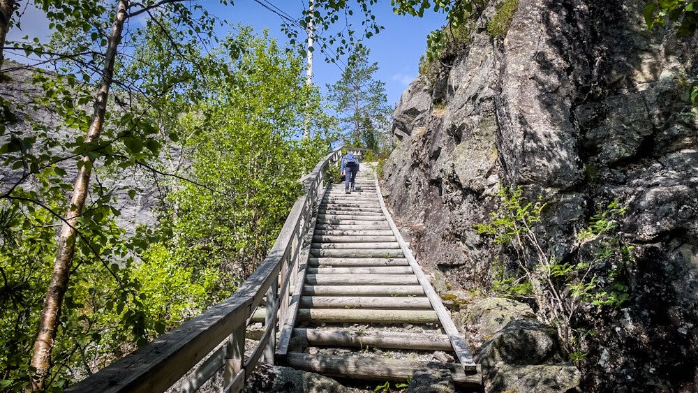 Heute ging es weiter im Setesdal. Um nicht nur im Camper zu sitzen und zu fahren, machten wir unterwegs ein kleine Wanderung. Wir gingen den Byklestigen. Das ist ein Wegabschnitt am Felsrand, entlang des Flusses Otra und war bis 1879 die einzige Verbindung  zwischen dem Ort Bykle und dem südlichen Setesdal. Früher war die engste Stelle 30 cm breit. Im Jahr 1879 wurde, dank der Erfindung des Dynamit 🧨, ein breiterer Weg in den Fels gesprengt. Diese Verbindung wurde im zweiten Weltkrieg durch die Deutschen Soldaten überwacht und man kann die Bunker im Wald noch sehen. Mit dem Bau des heutigen Tunnels verlor diese Strecke an Bedeutung. Unser Nachtlager schlagen wir auf einem Parkplatz in der Nähe des Skiortes Hovden auf.
