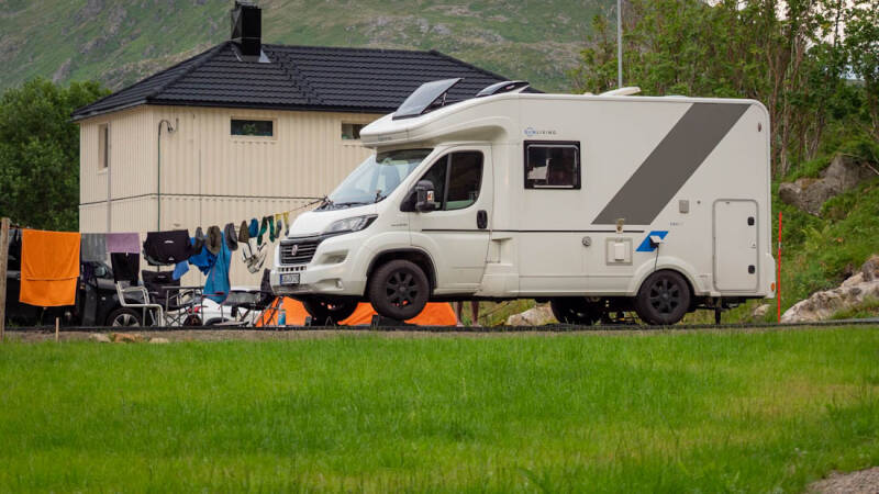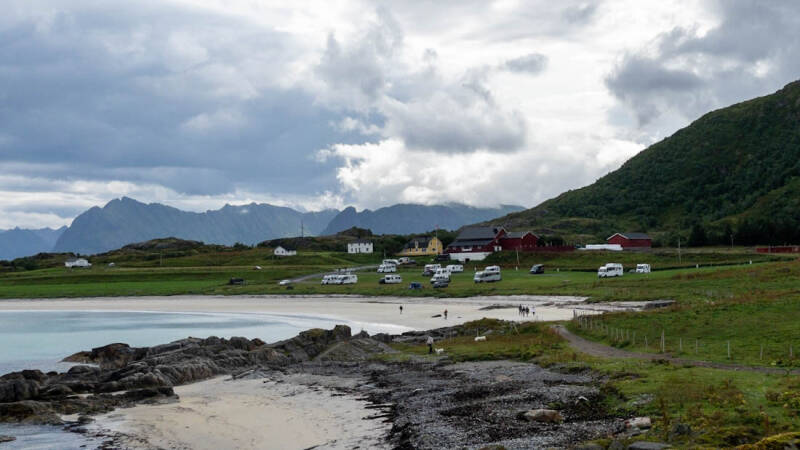 Nach einer "Brotzeit" zum Mittagessen ging es schließlich weiter nach Gimsøya auf den Campingplatz Hov Gård. Nach unserem vorherigen Stellplatz konnte dieser Campingplatz nur eine Enttäuschung sein. 😟 Aber die Aussicht aus dem Camper ist grandios.