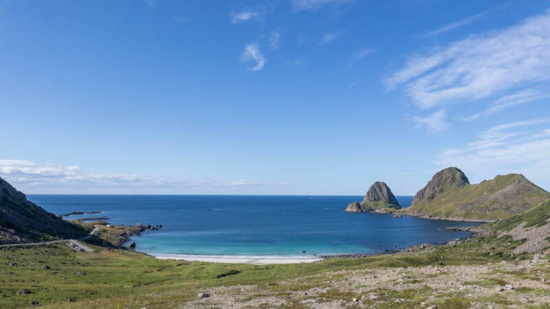 Heute wurde das Wetter wider Erwarten besser. Das war auch gut so, denn wir wollten heute Arons wichtigstes Ziel ansteuern. Es ging zum Kvalvika Beach bei Fredvang. Der Strand ist ein Touristenmagnet und dementsprechend war auch einiges los. Nach einem Aufstieg von 540 Höhenmetern, ziemlich steil und auch schmal, hatten wir einen fantastischen Blick auf den Strand, das Meer und die umliegenden Berge und Inseln. Die Landschaft ist einfach unglaublich, mehr gibt es dazu nicht zu sagen. Es hat sich wirklich gelohnt, hier raufzukrackseln und das noch bei dem herrlichen Wetter. Ich hoffe, die Bilder verdeutlichen dies. Auf der Heimfahrt zum Campingplatz ist unser linker Außenspiegel zum zweiten Mal zu Bruch gegangen. Die Straßen sind hier einfach sehr eng. Wenn sich zwei Wohnmobile begegnen und die Spiegel auf gleicher Höhe sind, kommt es eben manchmal zum Zusammenstoß. Aber alles halb so wild: Wir konnten es schnell wieder beheben.