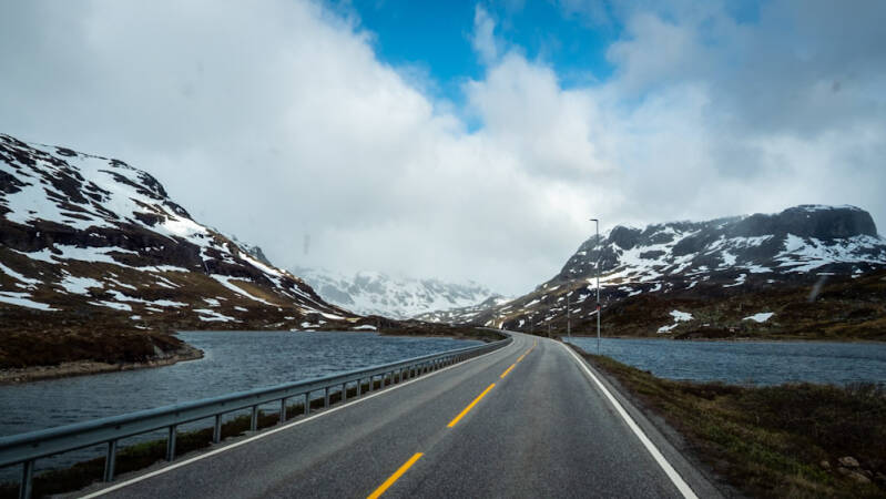 Um unser nächstes Etappenziel zu erreichen, mussten wir durch den längsten Straßentunnel der Welt, der Lærdaltunnel, er ist 24,5 Kilometer lang und für jede Fahrtrichtung einspurig. Das zieht sich, unterwegs erhellen Farbspiele die Eintönigkeit.😀 Anschließend ging es Straße hinauf zum Stegastein am Aurlandsfjord. Der Stegastein ragt 30 Meter aus dem Berghang hervor und ist 650 Meter über den Fjord. Die Anfahrt brachte uns beide zum Schwitzen. Wir sind noch nie so eine steile, enge, über lange Strecke ungesicherte Bergstraße gefahren. Als wir am Stegastein angekommen sind, beschlossen wir, diese Straße nicht mehr zurück zu fahren, sondern am Aurlandsfjellet einen Platz zum Übernachten zu suchen und am nächsten Tag nochmal den Tunnel zu fahren. Noch während unserer Planungen erreichte uns eine WhatsApp von Freunden, die wir schon am Südkap treffen wollten - aber es hatte nicht geklappt, dass sie in Laerdal am Campingplatz sind. Also sind wir ohne Zwischenstopp über das Aurlandsfjellet direkt nach Laerdal gefahren und haben einen tollen Abend mit unseren Freunden verbracht. Das Aurlandsfjellet war sehr beeindruckend und wir hatten endlich die hohen Schneewände am Straßenrand. Aber noch einmal würden wir diese Straße nicht mehr fahren.