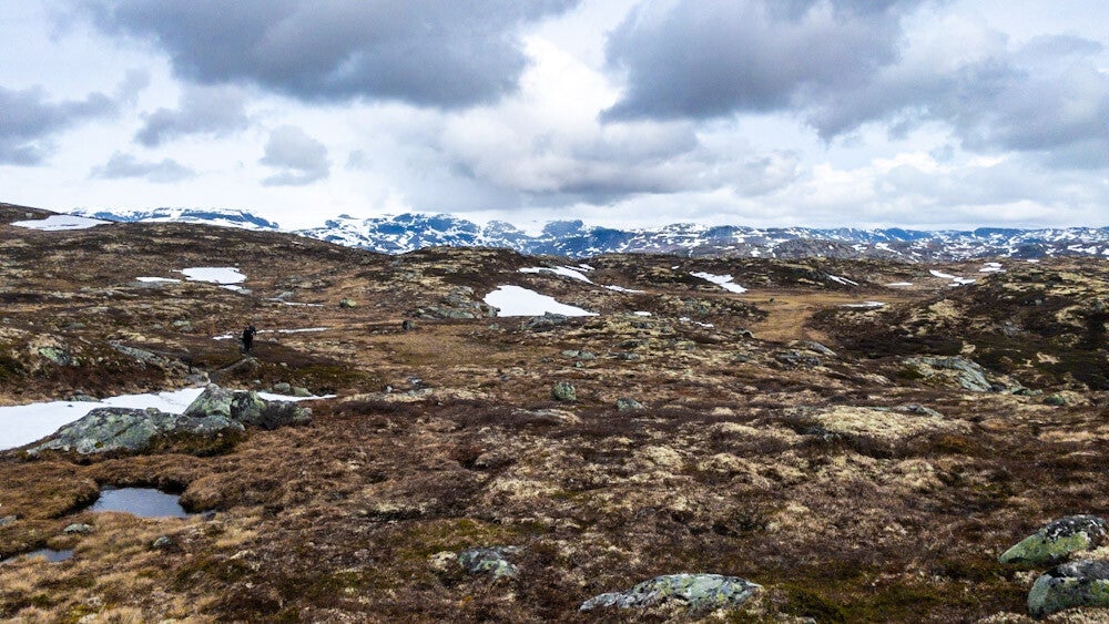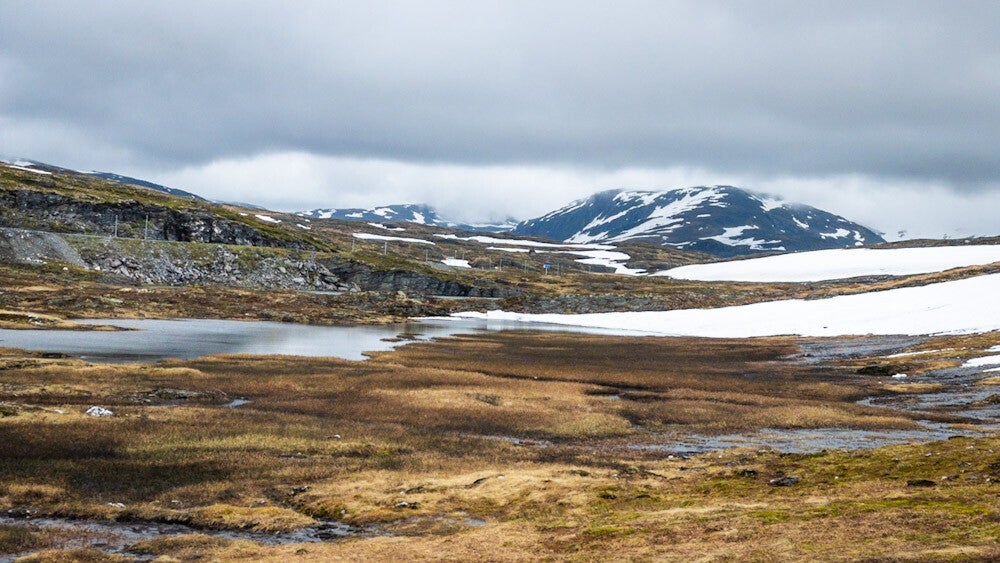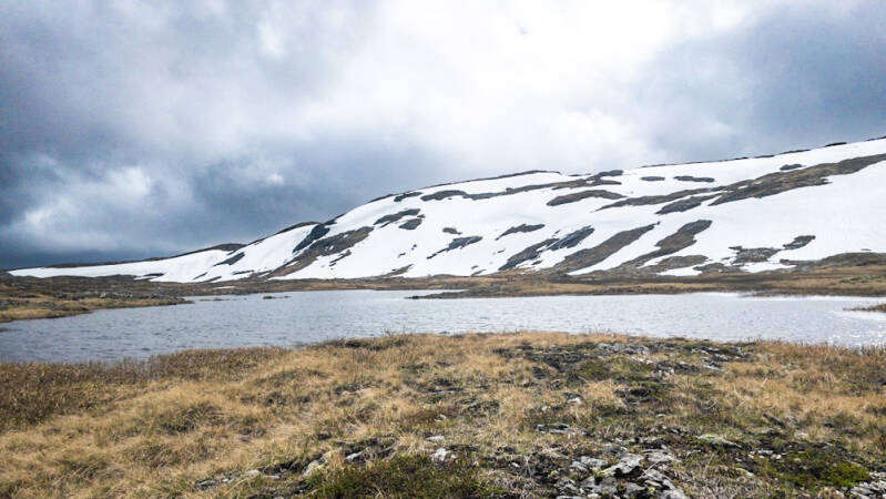 Heute machten wir eine, für unsere Verhältnisse extreme Wanderung durch die Hochebene Hardangervidda. Zu diesem Zweck buchten wir einen Parklatz abseits der Passstraße. Das Wetter schlug während der Wanderung Kapriolen: Regen, Schneeregen und Sonne. Hier oben im Naturpark ist im Juni noch mit winterlichen Verhältnissen zu rechnen, dass haben wir zu spüren bekommen.  Unterwegs waren wir fast alleine, es kamen uns nur zweimal anderen Wanderern entgegen. Auf der Strecke gab es viele Hochmoore und Schmelzwasserläufe, die wir überqueren mussten. Katrin ist auch einmal bis zum Knie eingesunken. Ich konnte ein Schneemoorhuhn fotografieren. Eigentlich wollte ich Rentiere finden, daraus wurde nur nichts. Im Hardangervidda lebt die größte wildlebende Rentierherde mit über 10000 Tieren. Auch hatten wir einen tollen Blick auf den Hardanger Gletscher. Die Landschaft ist ansonsten sehr karg und es gibt noch zahlreiche Schneefelder. Da wir den Parkplatz für 24 Stunden gebucht hatten, sind wir über Nacht in dieser wilden, einsamen Gegend geblieben und wir waren die Einzigen, die sich durch die kalte Nacht gebracht haben.