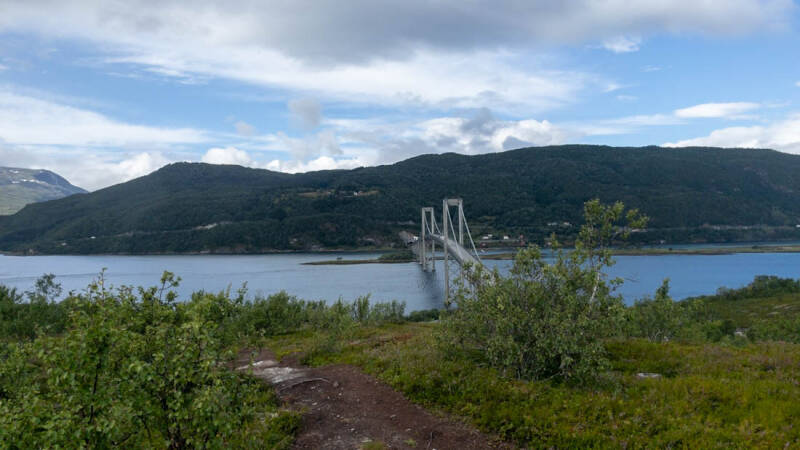 Und weiter geht es wieder Richtung Norden. Zuerst nach Steinsland zum Wandern. Wir wollten noch einen letzten Blick auf die Lofoten werfen, bevor es endgültig zurück aufs Festland ging. Die Wanderung begann an der Tjeldsund-Brücke und führte auf den Kvitnesveten. Von dort hatten wir auch einen tollen Blick auf die Brücke und die Lofoten, Senja und das Festland.