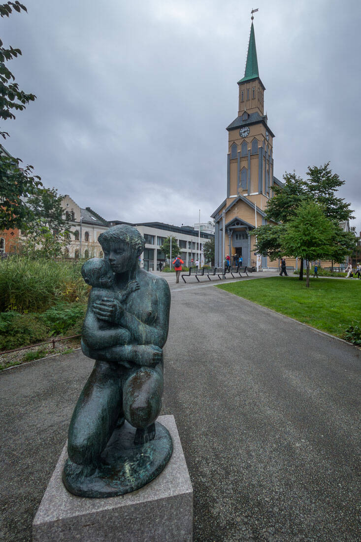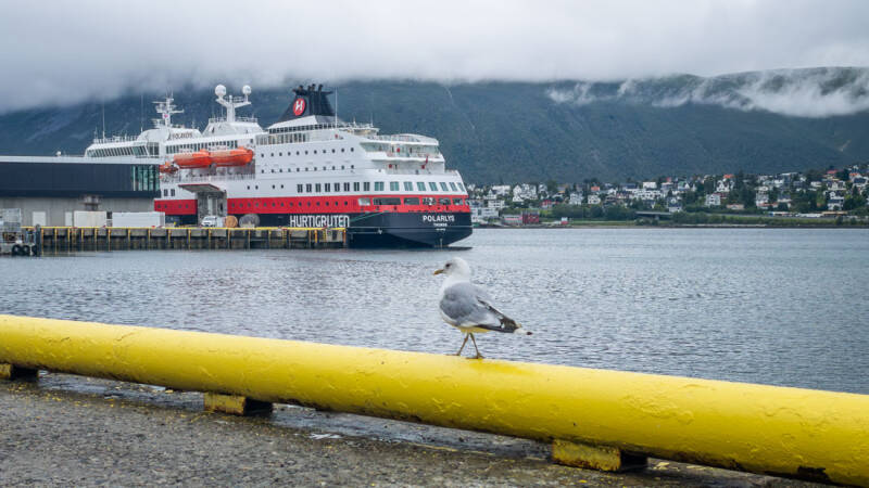 Dort sahen wir die Helmer Hanssen-Statue, ein altes Robbenfängerschiff, das Polaria Aquarium, das Hurtigruten-Schiff Polarlys und den Dom von Tromsø.
