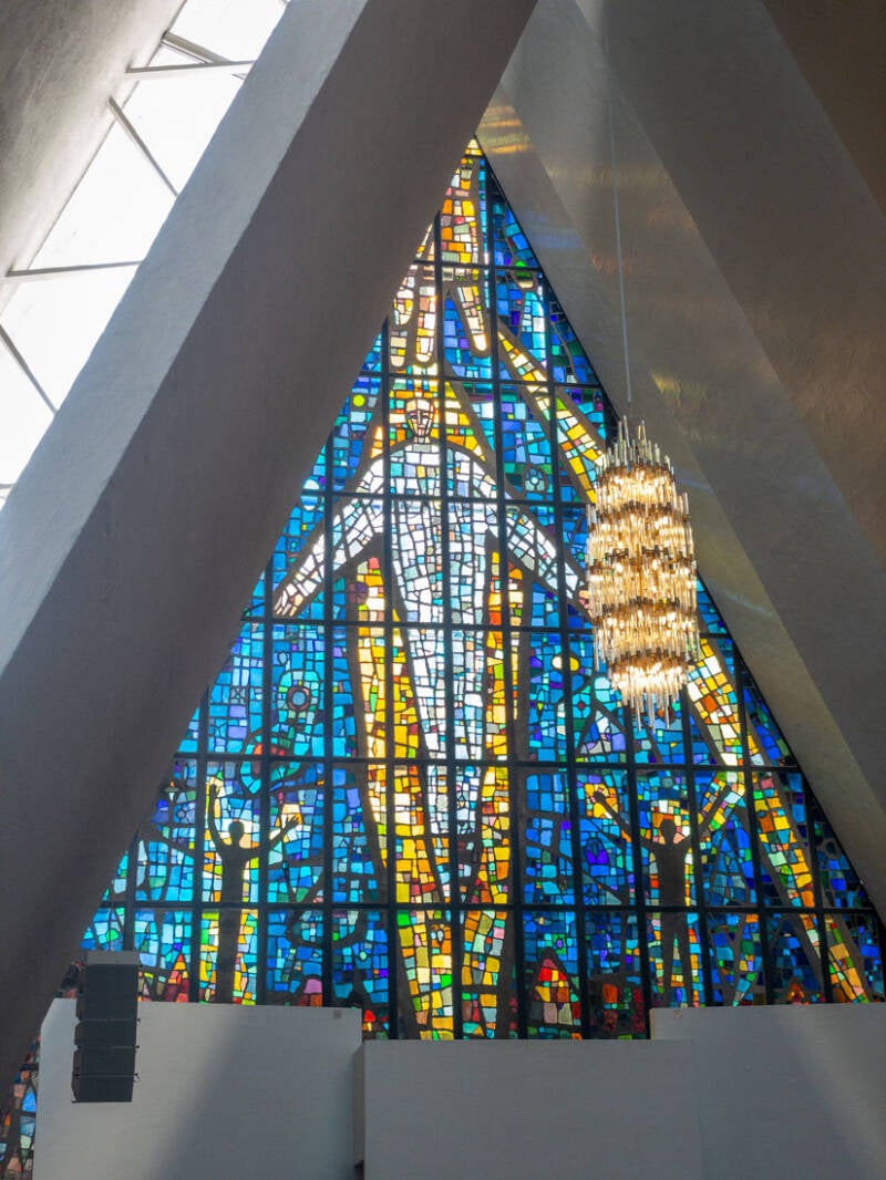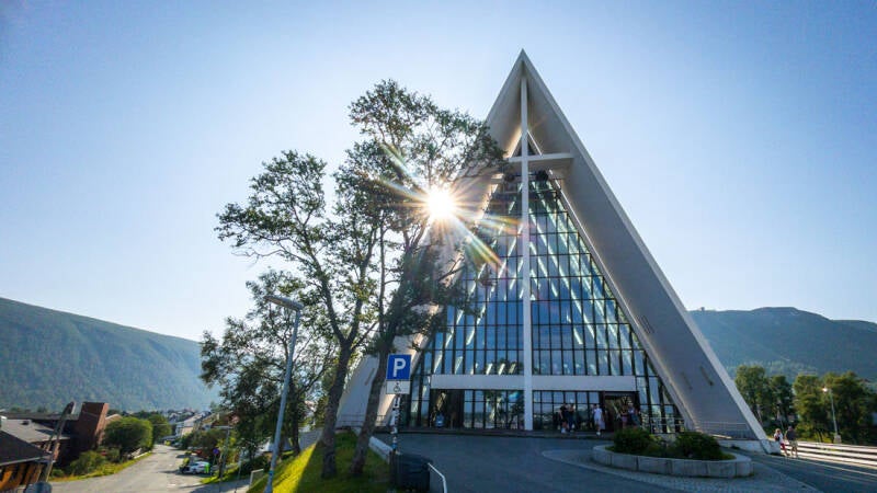 Die 1965 erbaute Kirche, offiziell Tromsdalen kirke, besticht durch ihre einzigartige Architektur, die an Eis oder ein Zelt erinnert. Das 23 Meter hohe Glasmosaik von Victor Sparre an der Ostwand ist das größte seiner Art in Europa. Die moderne Form und die nächtliche Beleuchtung machen sie zu einem Wahrzeichen der Stadt. Generell merkt man wieder den Tourismus in der Stadt: Wir haben drei Kreuzfahrtschiffe im Hafen gesehen und es waren sehr viele Menschen an und in der Kathedrale.