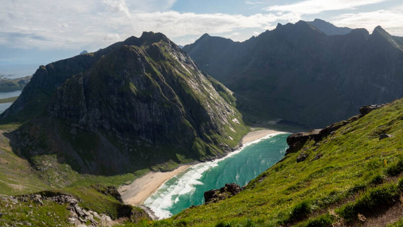 Heute wurde das Wetter wider Erwarten besser. Das war auch gut so, denn wir wollten heute Arons wichtigstes Ziel ansteuern. Es ging zum Kvalvika Beach bei Fredvang. Der Strand ist ein Touristenmagnet und dementsprechend war auch einiges los. Nach einem Aufstieg von 540 Höhenmetern, ziemlich steil und auch schmal, hatten wir einen fantastischen Blick auf den Strand, das Meer und die umliegenden Berge und Inseln. Die Landschaft ist einfach unglaublich, mehr gibt es dazu nicht zu sagen. Es hat sich wirklich gelohnt, hier raufzukrackseln und das noch bei dem herrlichen Wetter. Ich hoffe, die Bilder verdeutlichen dies. Auf der Heimfahrt zum Campingplatz ist unser linker Außenspiegel zum zweiten Mal zu Bruch gegangen. Die Straßen sind hier einfach sehr eng. Wenn sich zwei Wohnmobile begegnen und die Spiegel auf gleicher Höhe sind, kommt es eben manchmal zum Zusammenstoß. Aber alles halb so wild: Wir konnten es schnell wieder beheben.