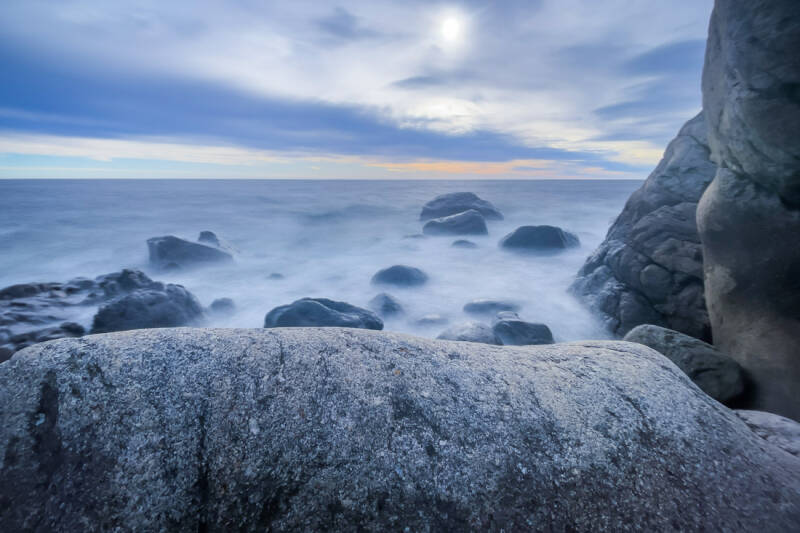 Bevor unsere Reise heute Richtung Stockholm weiterging, erkundeten wir noch einmal die felsige Küste – dieses Mal die andere Seite des Strandes. Hier befinden sich die berühmten Tunnelgrotten von Smitingen.